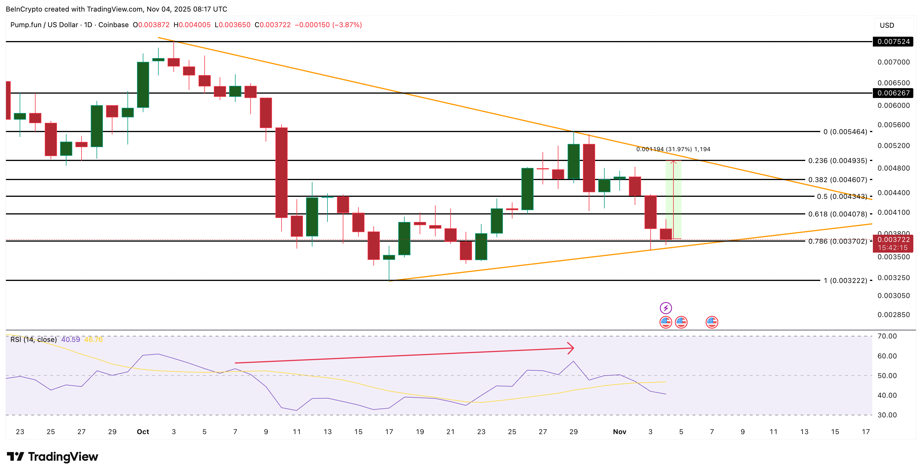 Однако нижняя линия тренда имеет лишь две точки касания, что делает ее относительно слабой. Если PUMP потеряет поддержку на уровне $0,0037, цена может упасть до $0,0032, что аннулирует сценарий восстановления.