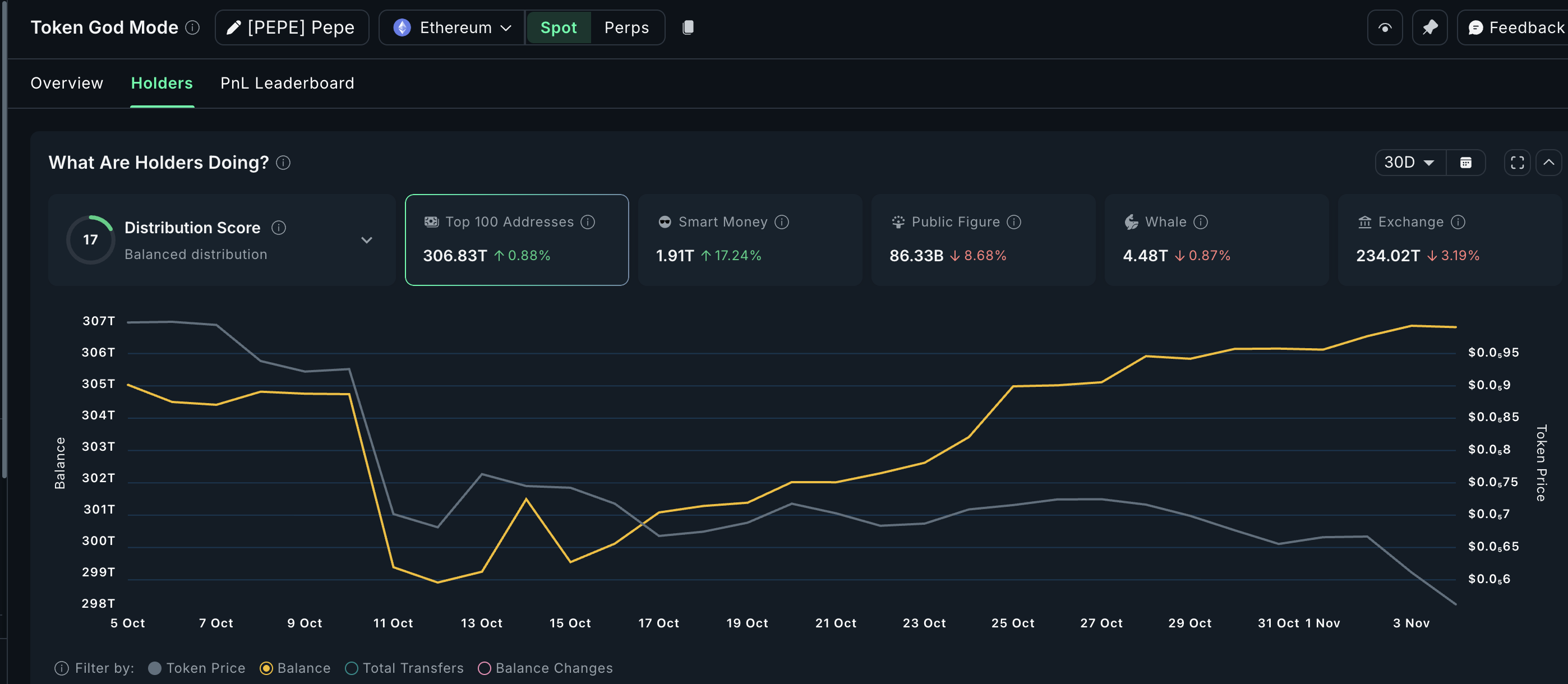 PEPE входит в число мемкоинов, за которыми стоит следить в ноябре. Удивительно, что этот мемкоин упал на 44% за последние 30 дней. Такая коррекция делает PEPE одним из крупнейших проигравших в категории мемкоинов.