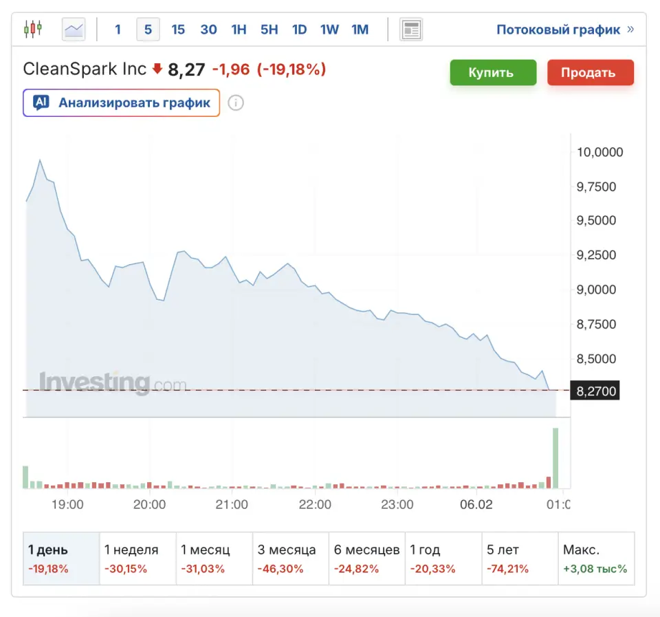 Акции CleanSpark (CLSK) потеряли 19,13% в ходе основной торговой сессии, а после ее завершения упали еще на 8,6%, до $7,55. В пятницу, 6 февраля, на премаркете цена скорректировалась, но незначительно — до $8,06.