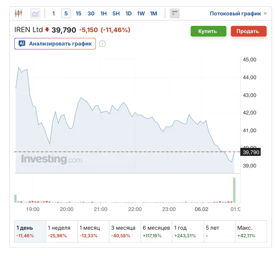 Акции майнинговой компании IREN упали на 11,46% в основной торговой сессии, а после ее завершения потеряли еще 18,5 %, опустившись до $32,42. За последний квартал 2025 года выручка компании составила $184,69 млн, что на 16,49% ниже прогнозов. Чистый убыток достиг $155,4 млн, и это контрастирует с прибылью в $384,6 млн за аналогичный период 2024 года. IREN тоже заявила о желании перейти с майнинга на ИИ.