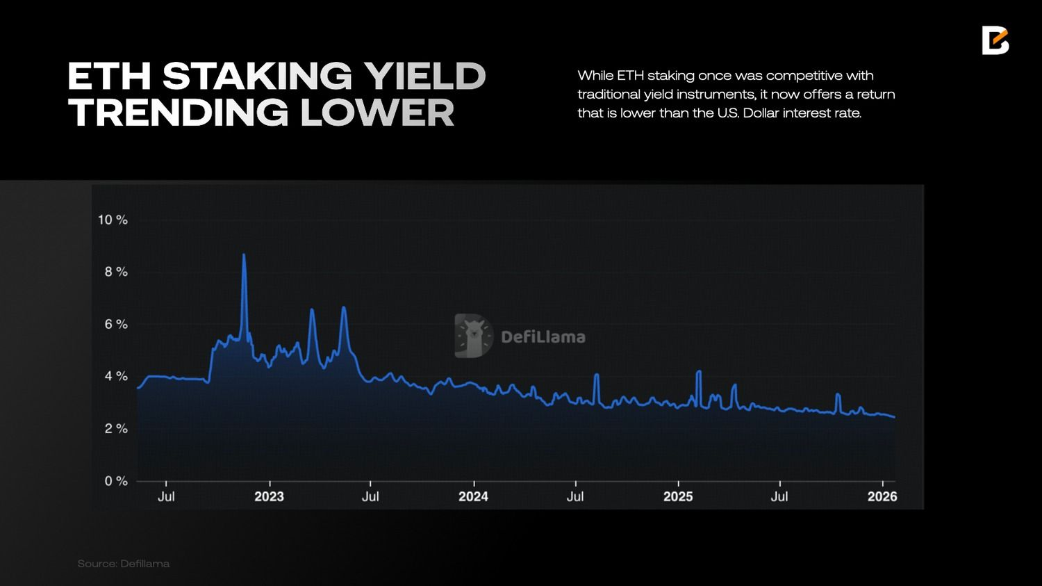 При этом данный тезис также сталкивается с ограничениями. Доходность стейкинга напрямую зависит от выручки сети, формируемой в основном комиссиями. Поскольку Ethereum целенаправленно снизил стоимость газа как в Layer 1, так и в Layer 2, доходность стейкинга устойчиво снижается. Если ранее она конкурировала с традиционными финансовыми инструментами, то теперь уступает процентным ставкам по доллару США.