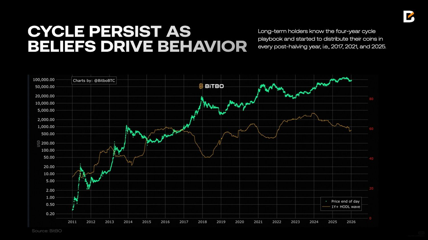 Ценность биткоина в значительной степени формируется ожиданиями инвесторов, поскольку актив не генерирует прибыли или денежных потоков. Это делает цену крайне чувствительной к поведению участников рынка. Четырехлетний цикл стабильно проявлялся во всех предыдущих периодах, а очередной пик вновь пришелся на четвертый квартал 2025 года. Инвесторы, прошедшие через несколько циклов, привыкли к этому ритму. Сами ожидания начинают влиять на рыночное поведение и тем самым усиливают цикл.