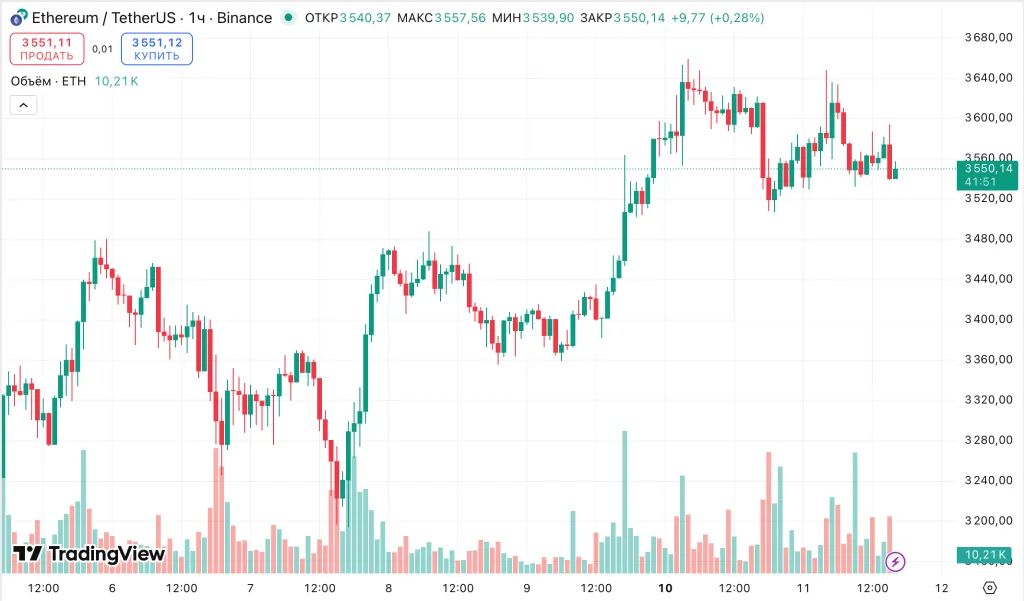 На момент написания вторая по капитализации криптовалюта торгуется по $3550. За последние сутки ее цена опустилась на 1,4%.