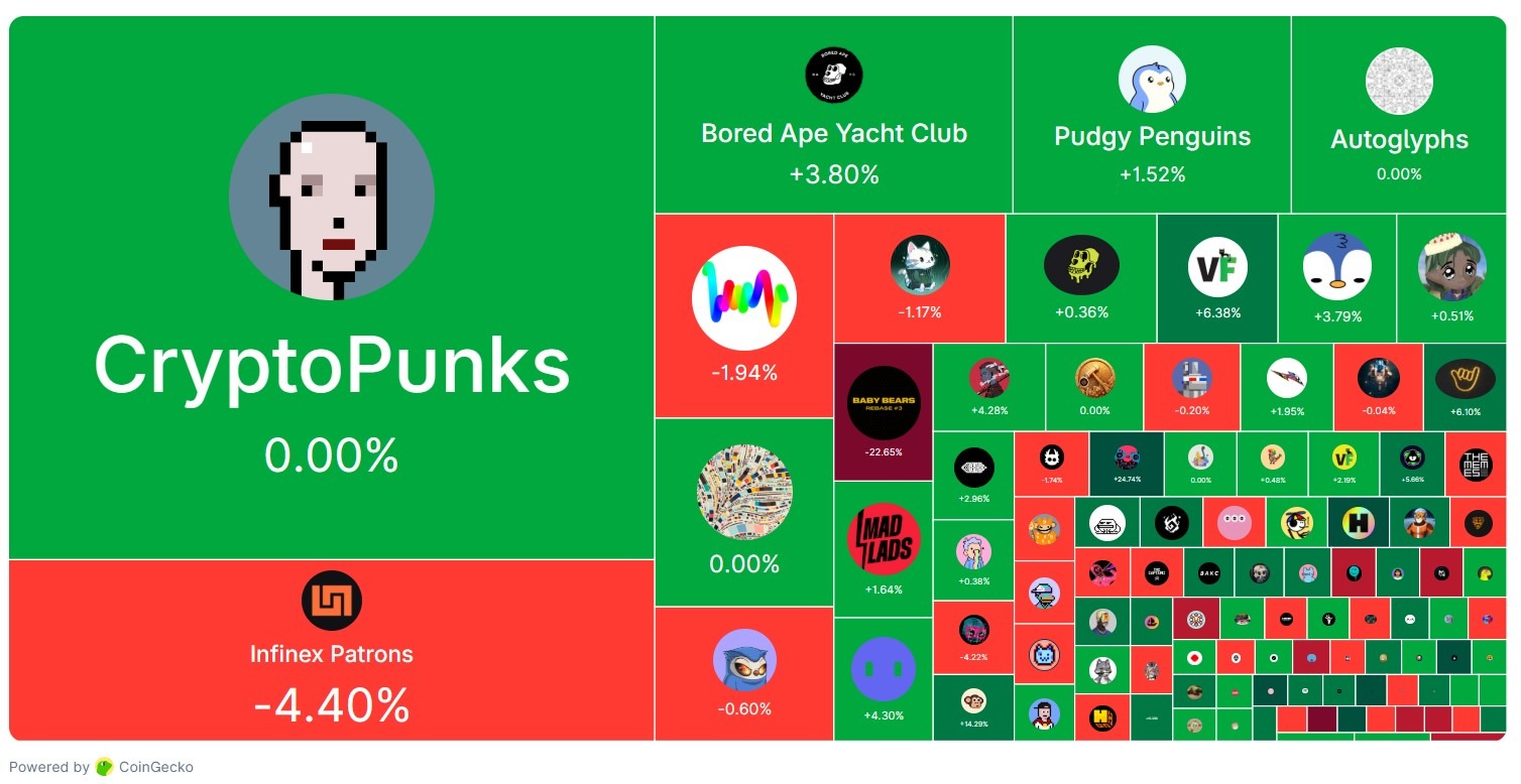 Во вторник рыночная капитализация NFT составляла чуть менее 2,7 миллиарда долларов, а всего за 24 часа выросла до 3 миллиардов долларов, увеличившись на 300 миллионов долларов. По данным CoinGecko, это сопровождалось ростом объёма торгов за 24 часа на 18,7%.