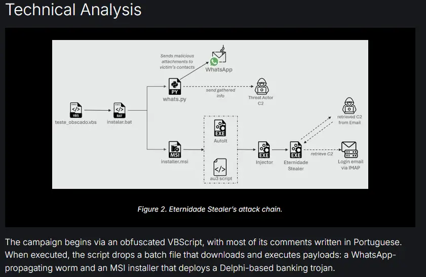 Согласно новому отчету исследовательской группы по кибербезопасности SpiderLabs компании Trustwave, банковский троян, известный как «Eternidade Stealer», распространяется через социальную инженерию в мессенджере WhatsApp с помощью «поддельных государственных программ, уведомлений о доставке», сообщений от друзей и мошеннических инвестиционных групп.