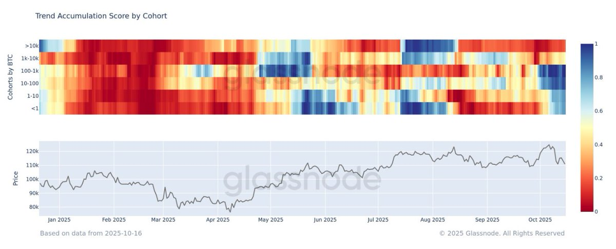 Данные Glassnode подтверждают этот тренд. Метрика Bitcoin Accumulation Score by Cohort показывает, что активность мелких держателей заметно выросла: кошельки с балансом от 1 до 1 000 BTC накапливают активы, а не продают их.