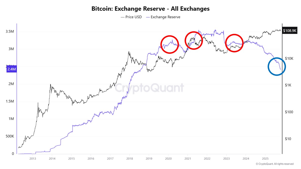 Главное отличие — динамика биржевых резервов. В предыдущие годы во время обвалов балансы криптовалют на централизованных биржах (CEX) резко росли: инвесторы переводили активы для продажи.