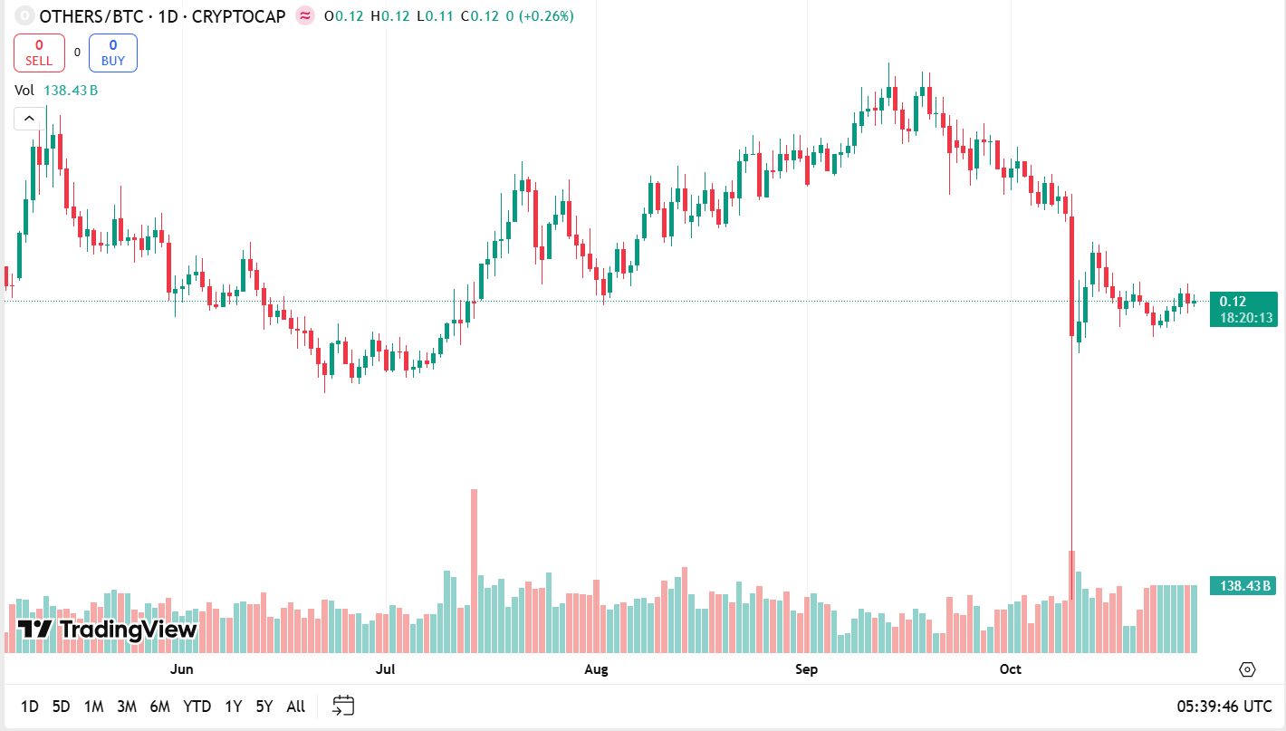 Тем не менее, возможный сдвиг может наметиться. График сравнения альткоинов и биткоина теперь демонстрирует значительное дно с бычьим пересечением MACD. Этот паттерн ранее появлялся лишь дважды, в 2017 и 2021 годах, и оба раза приводил к масштабному росту альткоинов.