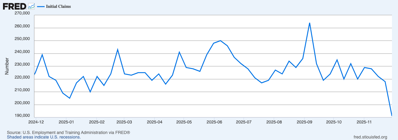 Первичные недельные заявки на пособие по безработице в США по состоянию на 29 ноября. Источник: St. Louis Fed.