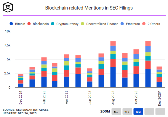 Упоминания, связанные с биткоином, доминировали, занимая наибольшую долю в общем объеме подаваемых документов. Эта концентрация отражает распространение заявок и поправок к документам, которые касаются биткоин-ETF, после успешного запуска нескольких продуктов в начале 2024 года, поскольку традиционные управляющие активами продолжали расширять свои предложения в сфере криптовалют в течение 2025 года.