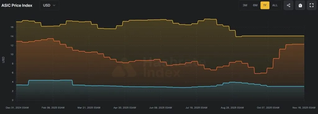 По данным Hashrate Index, рыночные котировки установок с показателем от 19 J/TH в последние месяцы стабильно удерживаются вблизи $14 за TH/s.