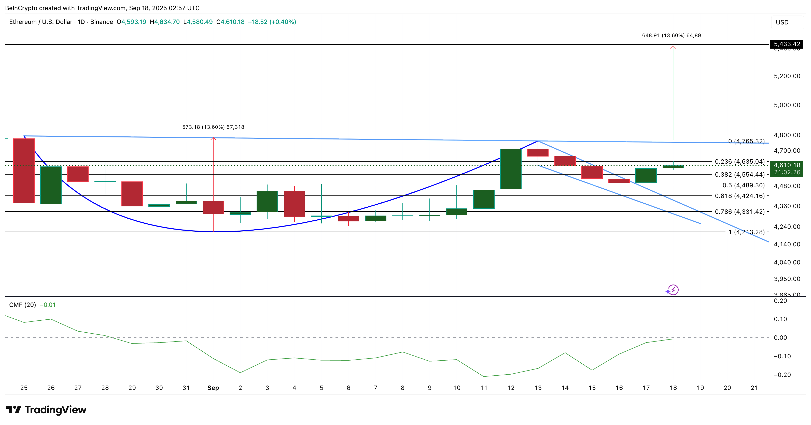 Линия «шеи» этой модели находится около $4 765. Если цена Ethereum закроется выше нее, цель прорыва достигнет $5 430, что станет новым годовым максимумом.