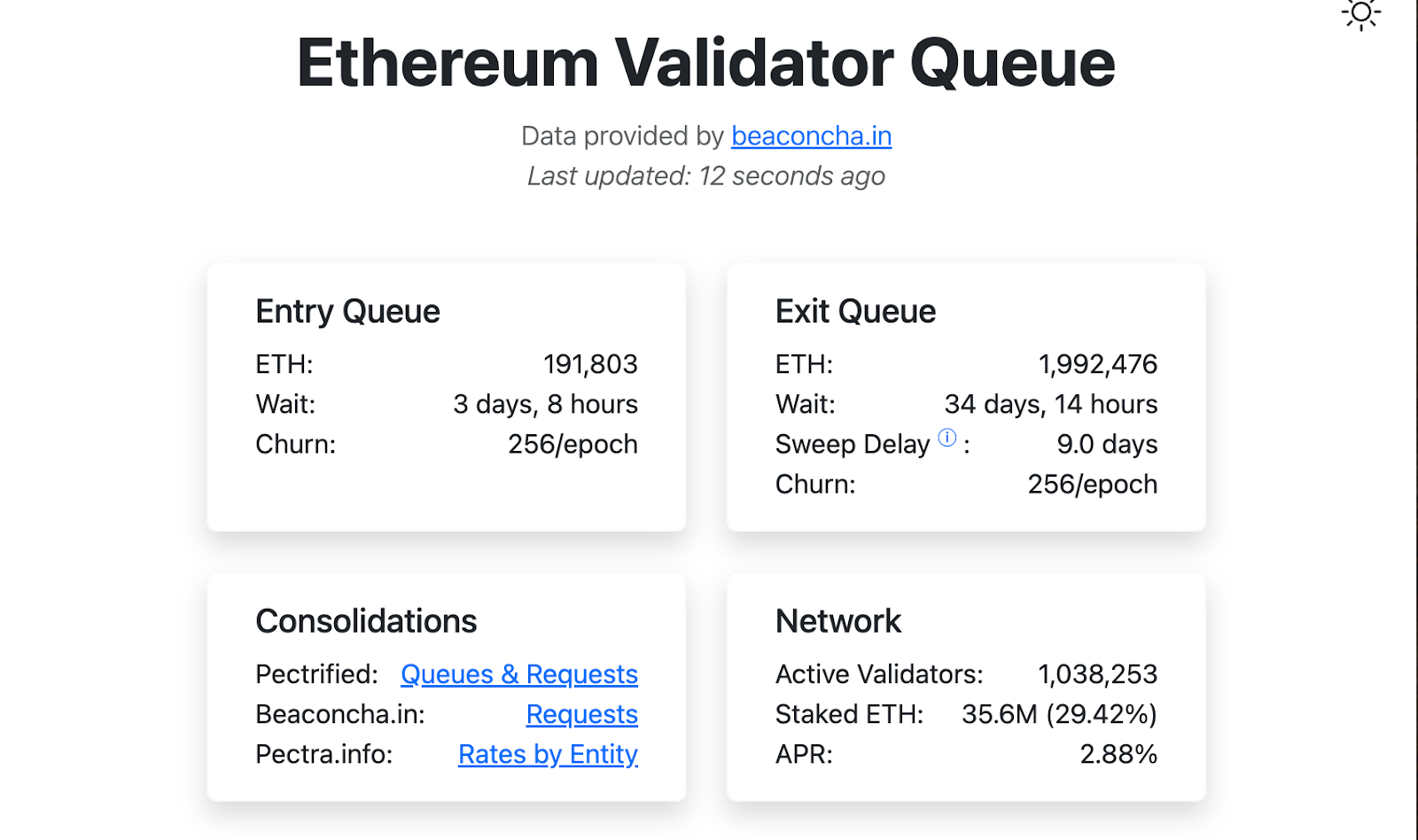 Данные по цепочке блоков показывают, что в настоящее время среднее время ожидания входа в систему стейкинга Ethereum составляет около трех дней, а очередь выхода — около 34 дней, при этом более 2 миллионов токенов ожидают вывода.