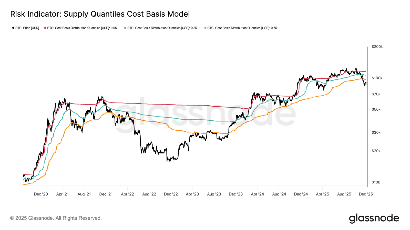 Структура рынка биткоина в последние недели напоминает первый квартал 2022 года: более четверти монет были куплены по цене выше текущей, написано в отчете Glassnode. Ключевой зоной для восстановления структуры рынка эксперты считают диапазон от $96 тыс. до $106 тыс. — неспособность закрепиться на этих уровнях повышает риск дальнейшего падения.