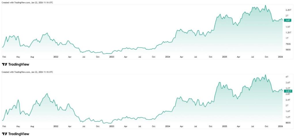 Пятилетние графики BTC и общей рыночной капитализации криптовалют, демонстрирующие влияние биткоина. Источник: TradingView
