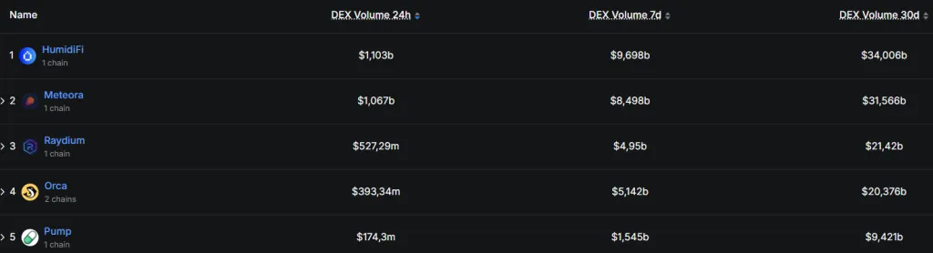 HumidiFi стала крупнейшей децентрализованной площадкой в экосистеме Solana. За последние сутки объем торгов на платформе достиг $1,1 млрд, а за 30 дней — $34 млрд.
