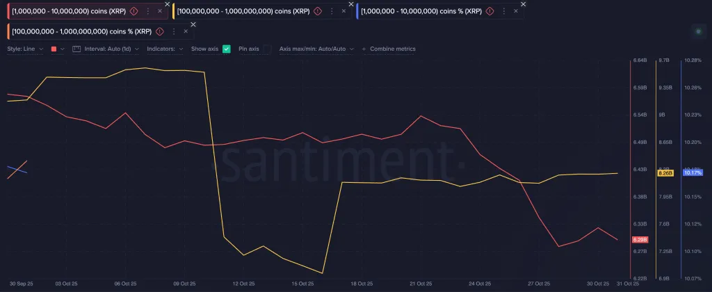 При этом крупные адреса начали аккумулировать актив. За последние две недели киты с балансом от 100 млн до 1 млрд XRP увеличили запасы с 6,9 млрд XRP до 8,24 млрд XRP.