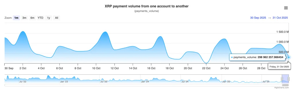 Ончейн-активность XRP значительно снизилась. С начала октября объем платежей — ключевой показатель полезности сети XRPL — упал почти на 70%, с 1,5 млрд до 298 млн.