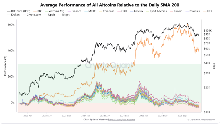 Альткоины продолжают испытывать трудности из-за технического давления и оттока капитала в сторону биткоина. По данным CryptoQuant, альткоины сейчас примерно на 27% ниже своей 200-дневной простой скользящей средней. За этим уровнем пристально следят трейдеры и инвесторы, поскольку это указывает на устойчивую слабость, а не на кратковременный откат.