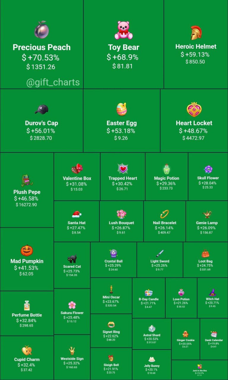 Основатель Telegram Павел Дуров опубликовал в своем канале скриншот панели с ценами на коллекционные подарки внутри мессенджера. За последний месяц стоимость многих популярных наборов выросла на 20–70%.
