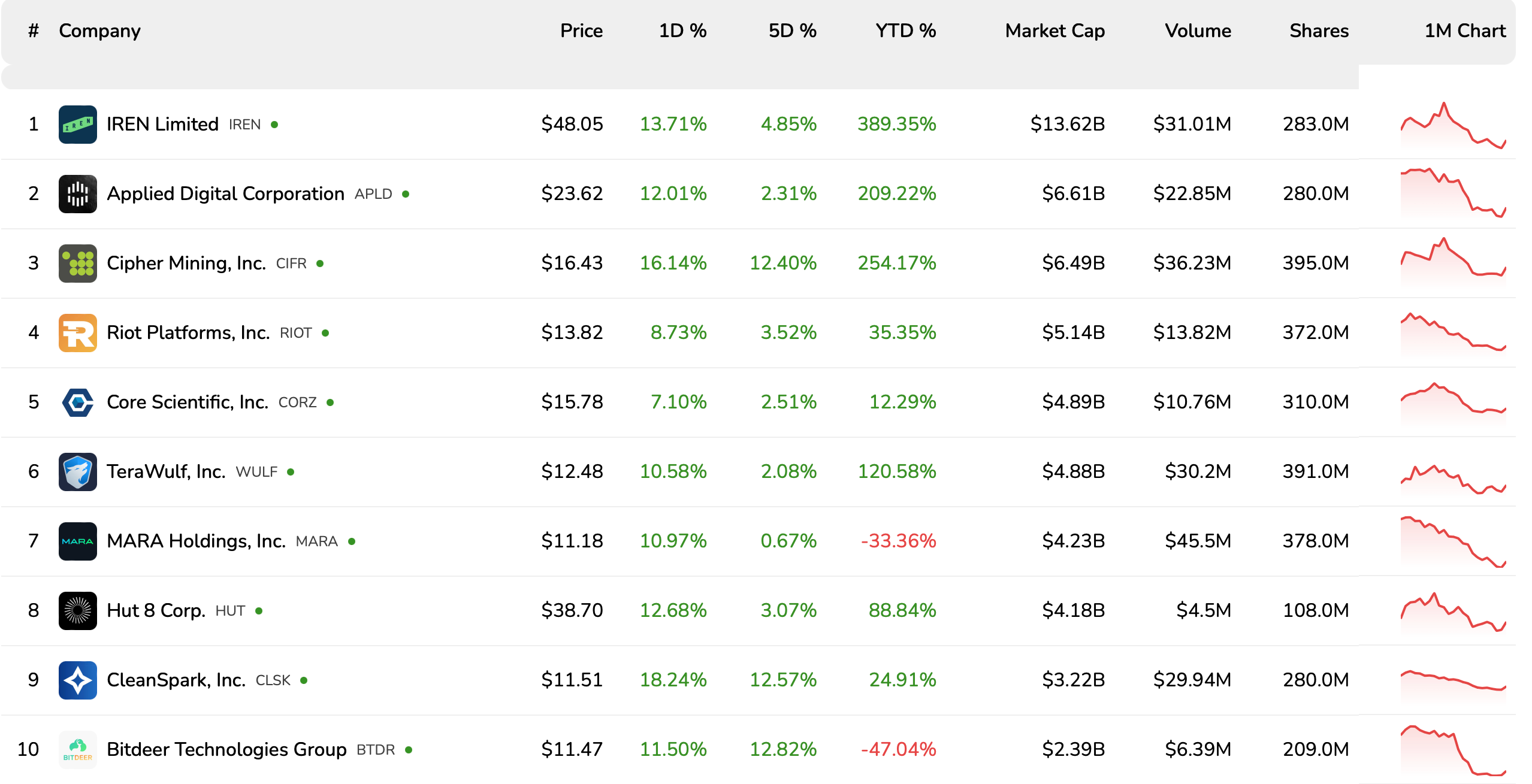 Несмотря на ухудшение экономической ситуации в секторе, акции 10 крупнейших публичных майнеров выросли за последние 24 часа. CleanSpark, Cipher Mining и IREN в понедельник показали двузначный прирост.