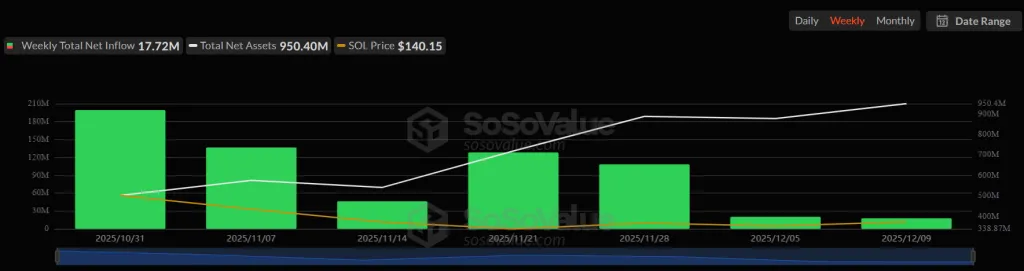 Поддержку активу оказывают два фактора: отток монет с бирж и приток капитала в спотовые ETF на базе Solana. По данным SoSoValue, за неделю биржевые фонды привлекли $17,72 млн.