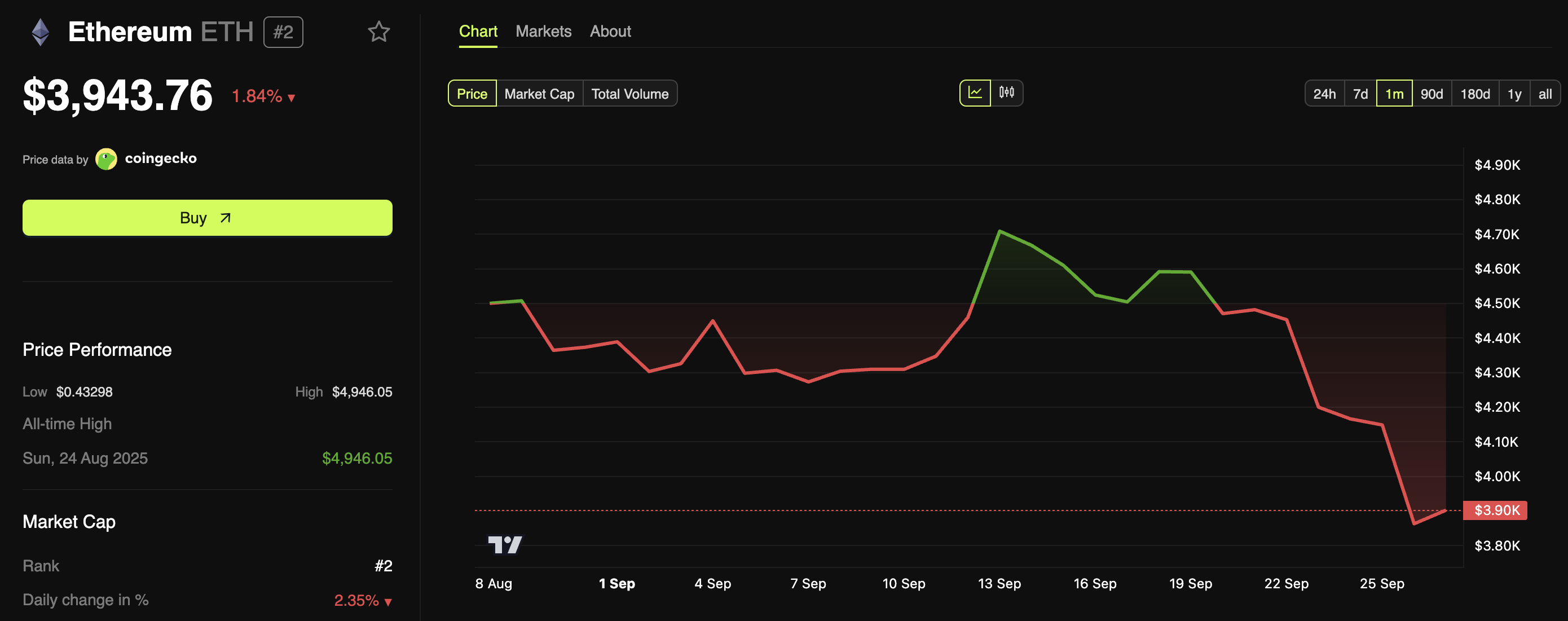 По последним данным BeInCrypto Markets, цена ETH упала на 1,84% за последние сутки, опустившись ниже $4 000. На момент написания статьи альткоин торговался по $3 943.
