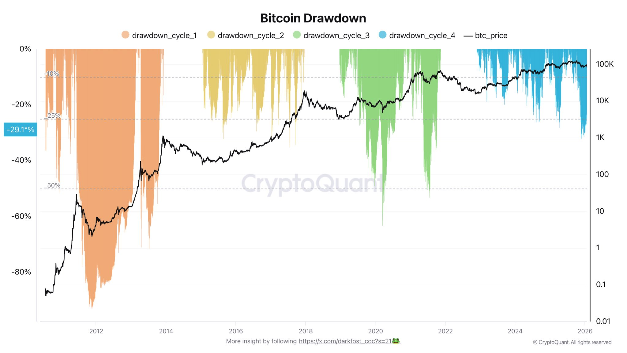 Текущую коррекцию аналитик Darkfost оценил как самую глубокую в рамках текущего цикла — примерно 30% от пика. Однако он отметил, что это падение все еще остается в среднем диапазоне для этого рыночного цикла.