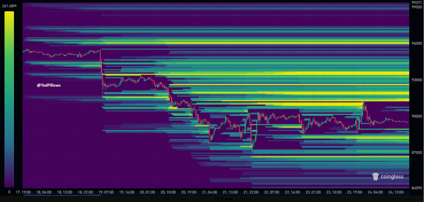 Тем временем популярный в криптосообществе эксперт Тэд Пиллоуз проанализировал расположение ликвидности на рынке. Она активно консолидируется на уровнях ниже текущей цены — в зонах $88 000 и $86 500. С другой стороны, на пути вверх биткоин сталкивается с огромными кластерами в диапазоне от $92 000 до $96 000.