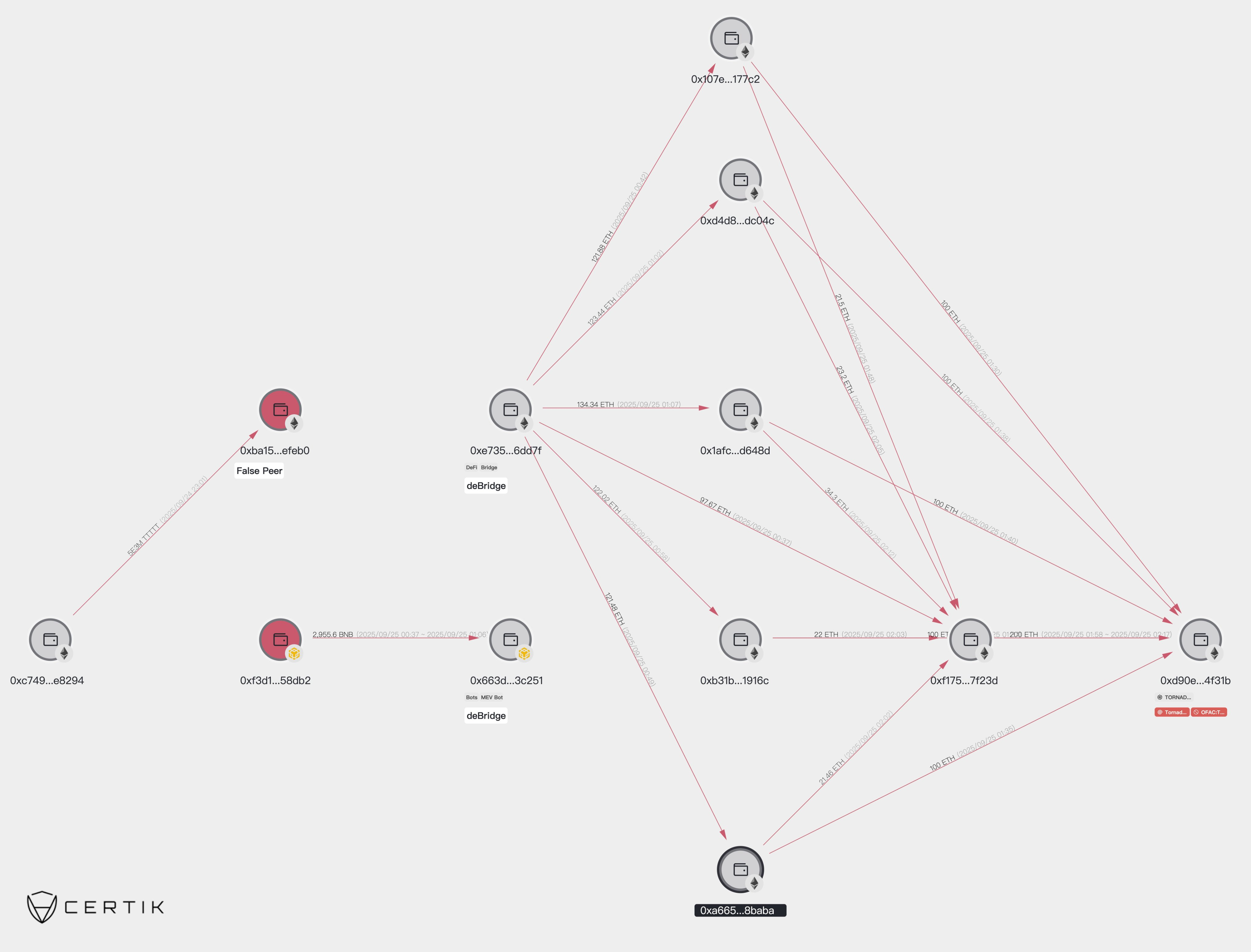 Китайский криптожурналист и аналитик Колин Ву сообщил, что по состоянию на 7:04 утра (UTC+8) адрес 0xF3…8Db2 выпустил 5 миллиардов GAIN с Null-адреса (0x00…0000), увеличив общий объем эмиссии до 5,2985 миллиарда. Вскоре после этого с того же адреса было продано 147,5 миллиона GAIN на PancakeSwap. Эта операция принесла злоумышленнику не менее 2 955 BNB, которые затем были переправлены через протокол deBridge.