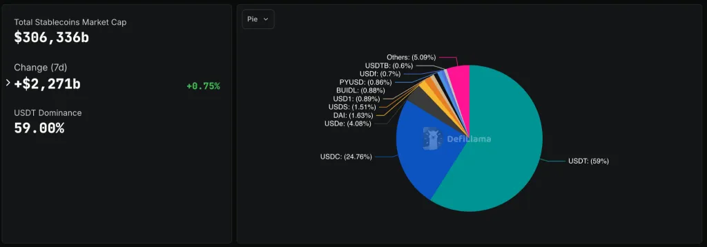 На момент написания капитализация сектора «стабильных монет» оценивается в $306 млрд. Доминирующим игроком остается USDT, доля которого составляет 59%.