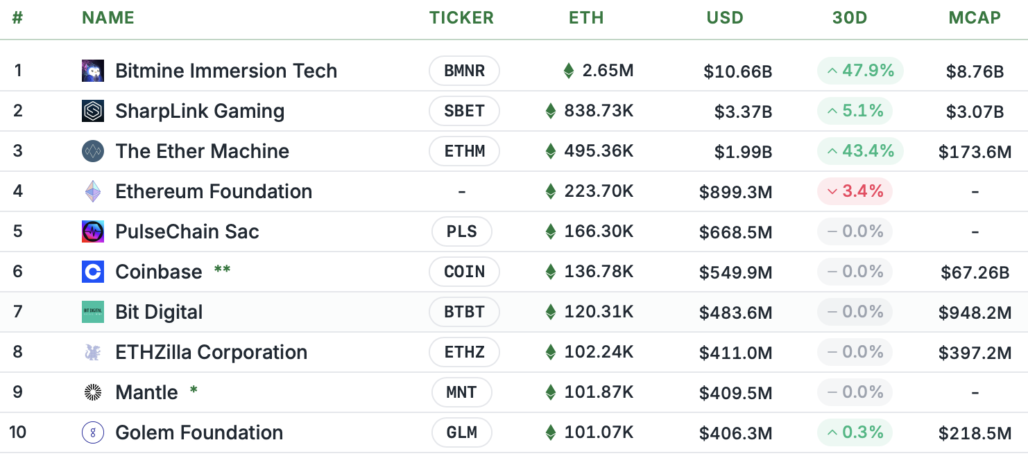 Топ-10 корпоративных держателей Ethereum. Источник: Strategic ETH Reserve