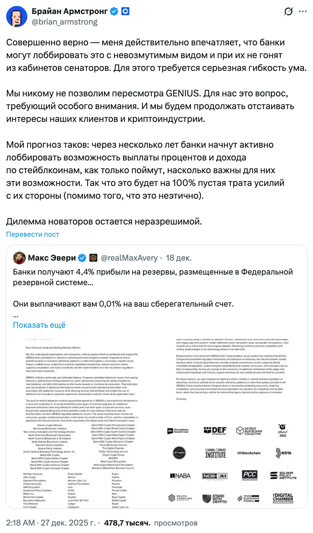 Комментарии Армстронга последовали в ответ на публикацию Макса Эйвери, члена правления и руководителя по развитию бизнеса в Digital Ascension Group. Эйвери объяснил, почему часть банковского сектора добивается пересмотра законодательства.