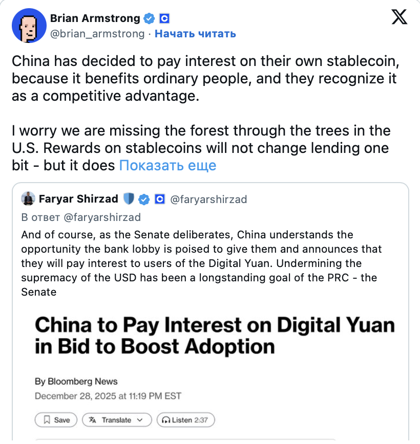 Гендиректор Coinbase Брайан Армстронг использует пример Китая для обоснования необходимости реформ в американском секторе стейблкоинов. Подобная риторика возникла в момент, когда площадка стремится сохранить ключевой источник дохода, оказавшийся под угрозой из-за действий банковского лобби.