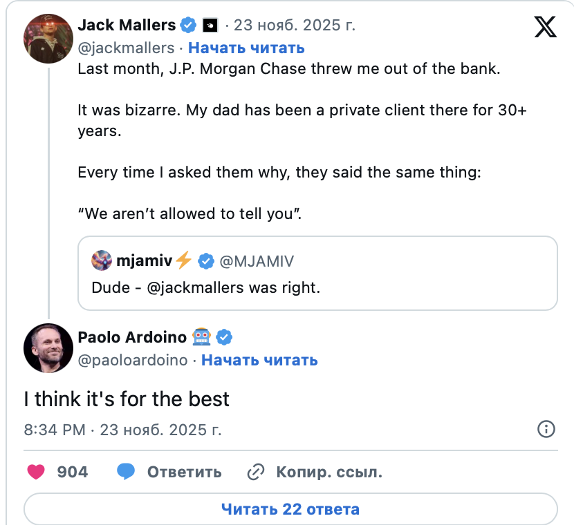 В серии публикаций в социальной сети X (ранее Twitter) Маллерс рассказал детали инцидента. В прошлом месяце JPMorgan уведомил его о расторжении договора. Предприниматель отметил, что его семья являлась клиентом банка на протяжении трех десятилетий.
