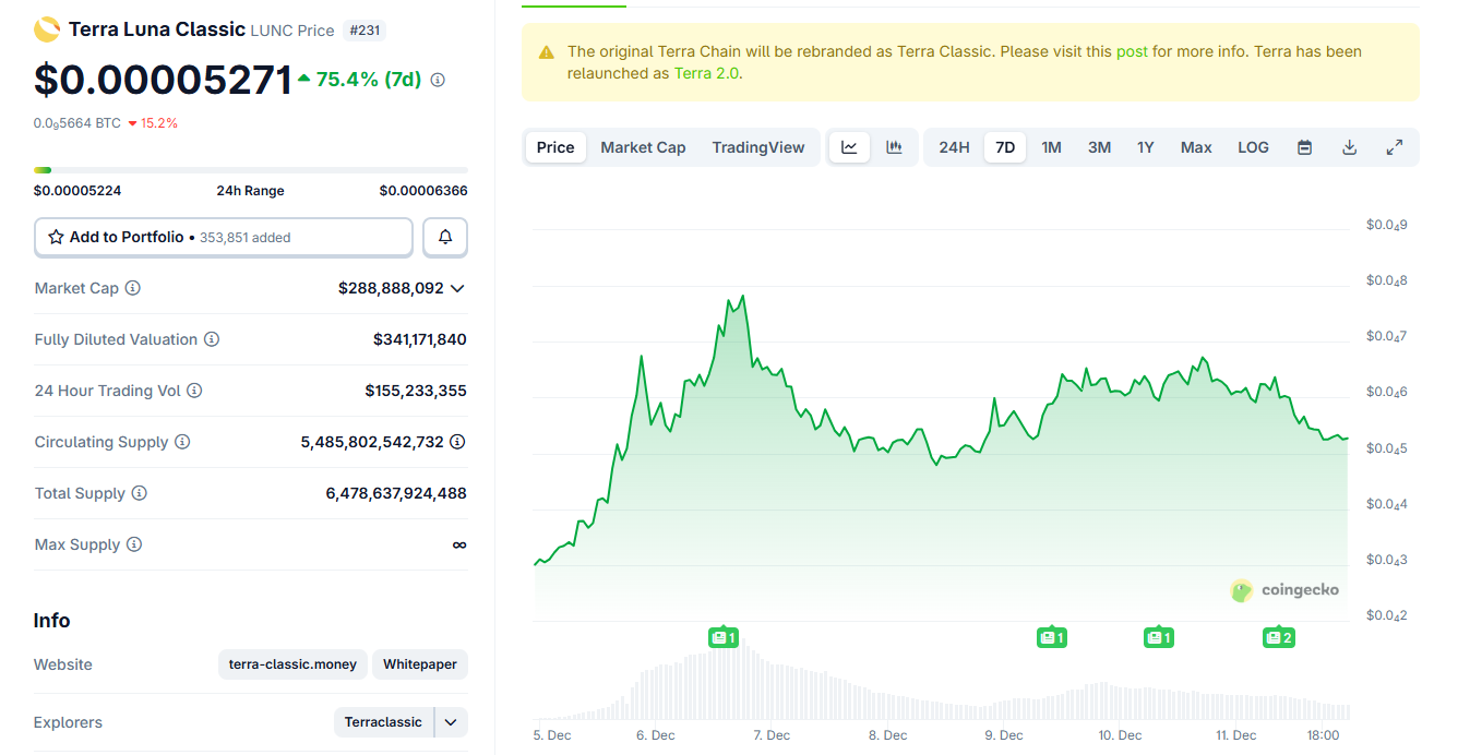 Динамика цены Terra Luna Classic (LUNC) за последнюю неделю. Источник: CoinGecko