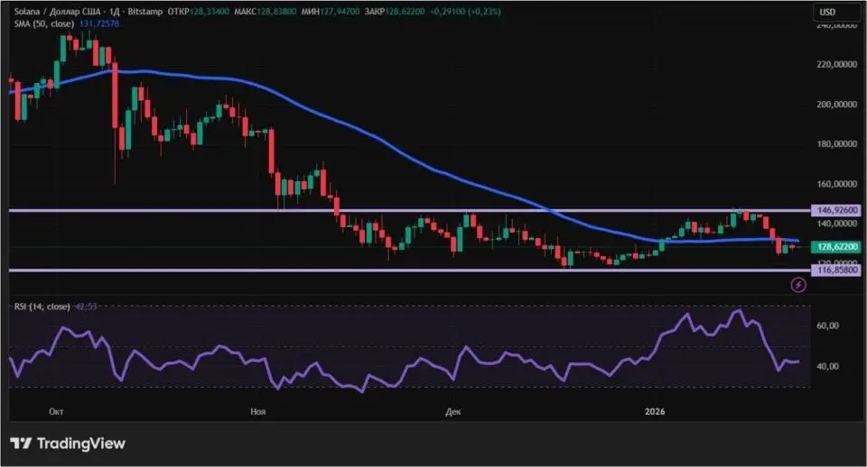 Индикаторы технического анализа снова свидетельствуют о превалировании продавцов Solana. Цена вновь опустилась ниже 50-дневной скользящей средней (обозначена синим цветом). RSI упал ниже 50, что также говорит в пользу медведей. Уровни поддержки и сопротивления на дневном графике: $116,86 и $146,93. Примечательно, что SOL поднималась выше $146,93 в середине января, однако закрепиться там не смогла.