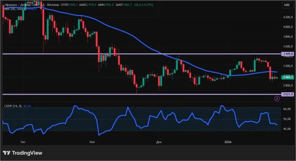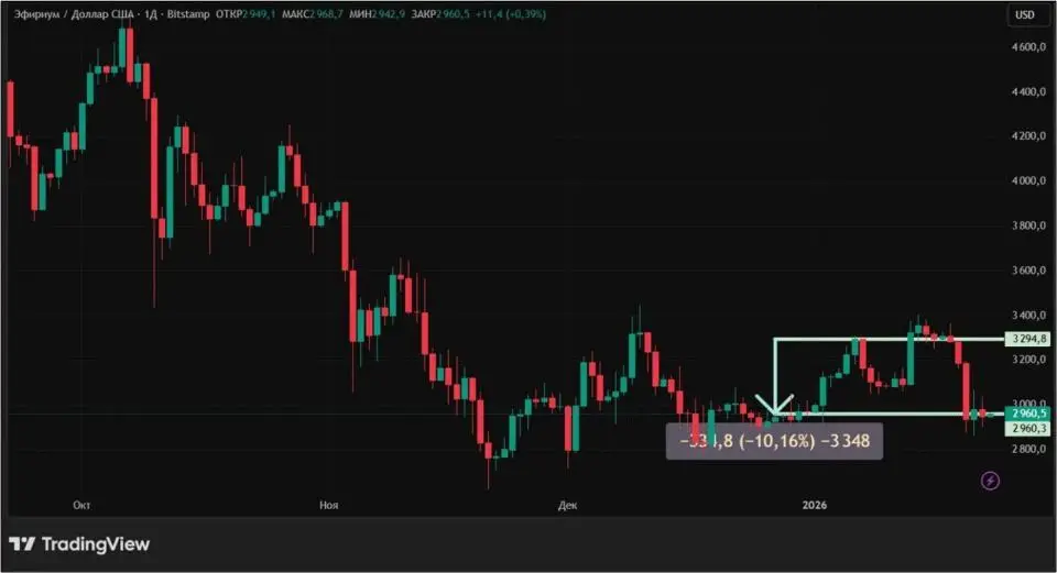 Снижение эфира за семь дней, с 16 по 23 января, составило более 10%. ETH вернулся к уровням, на которых торговался в конце декабря. Важный психологический рубеж в $3000 удержать не удалось.