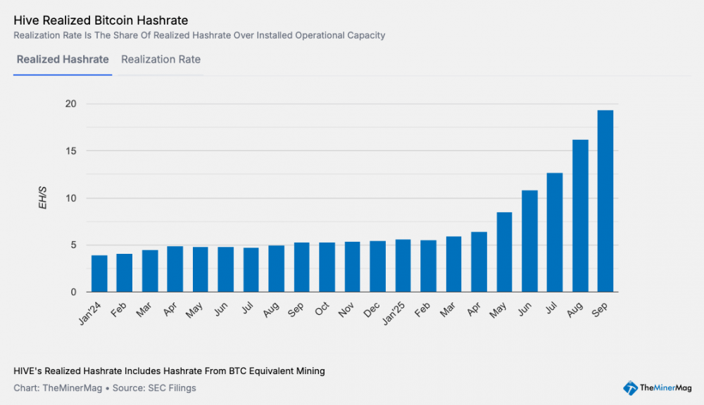 HIVE станет одним из самых быстрорастущих майнинговых предприятий в 2025 году благодаря подключению парагвайских объектов к Cipher и Bitdeer. Реализованный хешрейт HIVE увеличился с 5,66 EH/s в январе до 19,34 EH/s в сентябре. Это делает HIVE шестым по величине публичным оператором майнинга биткоинов в Северной Америке.