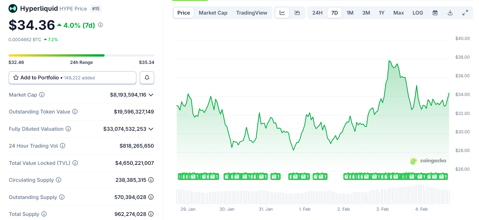 $HYPE за последнюю неделю»> График цены $HYPE за последнюю неделю. Источник: CoinGecko
