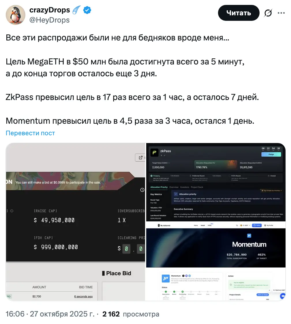 События по продаже токенов для протокола конфиденциальности zkPass, децентрализованной биржи Momentum и сети второго уровня Ethereum MegaETH были значительно переподписаны на этой неделе. Частные инвесторы активно стремятся получить долю в развивающихся криптопроектах.