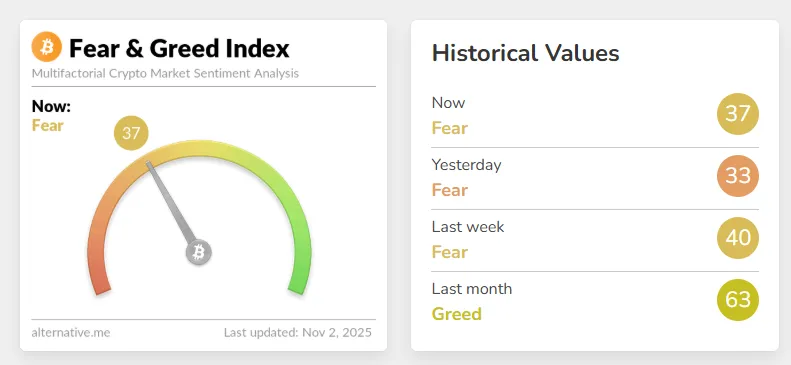 Криптовалютный индекс страха и жадности находится на 37 баллах, обозначая «страх» на рынке.