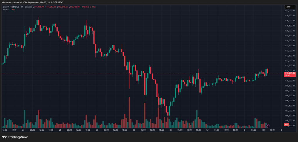 Затем биткоин восстановился к $110 000 после «замечательной» встречи президентов США и КНР — Дональда Трампа и Си Цзиньпиня. На ней стороны договорились о смягчении пошлин.