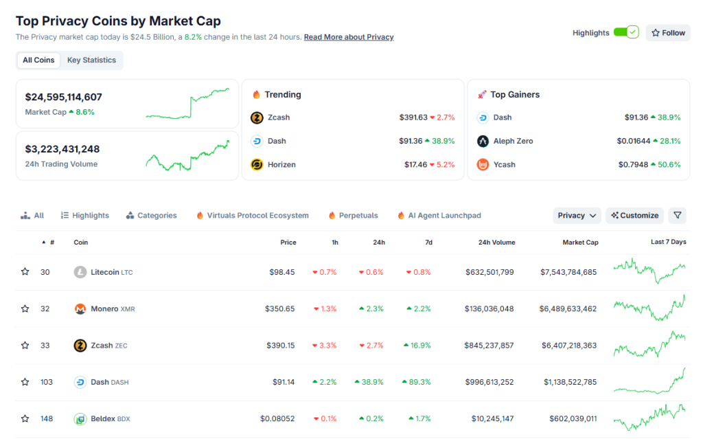 Основным драйвером направления стал Zcash (ZEC). За последние семь дней цена актива выросла на 16%, за месяц — на 163%.