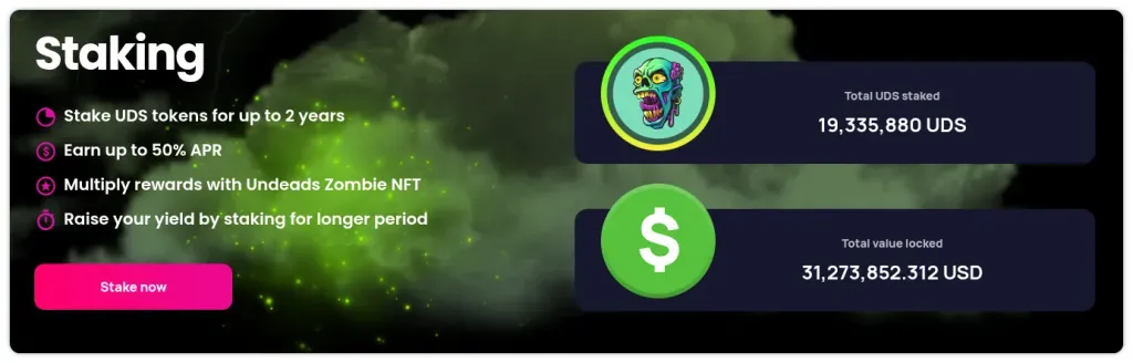 Объем заблокированных в стейкинге токенов Undeads Games (UDS) достиг отметки в $30 млн. Об этом ForkLog сообщили представители GameFi-проекта.