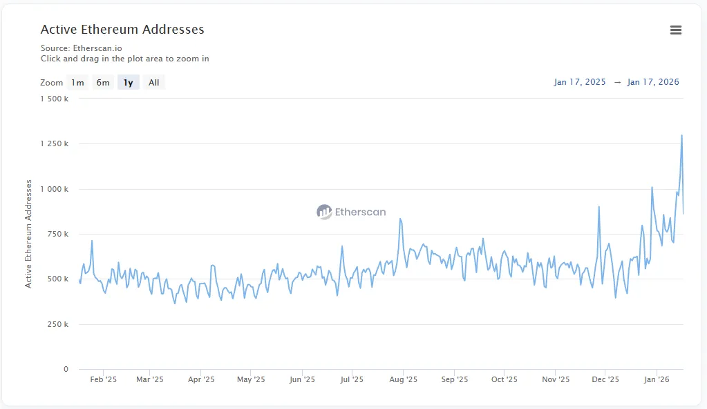 15 января количество ежедневно активных адресов в сети Ethereum перешагнуло отметку в 1 млн — это более чем вдвое выше показателей прошлого года (410 000).