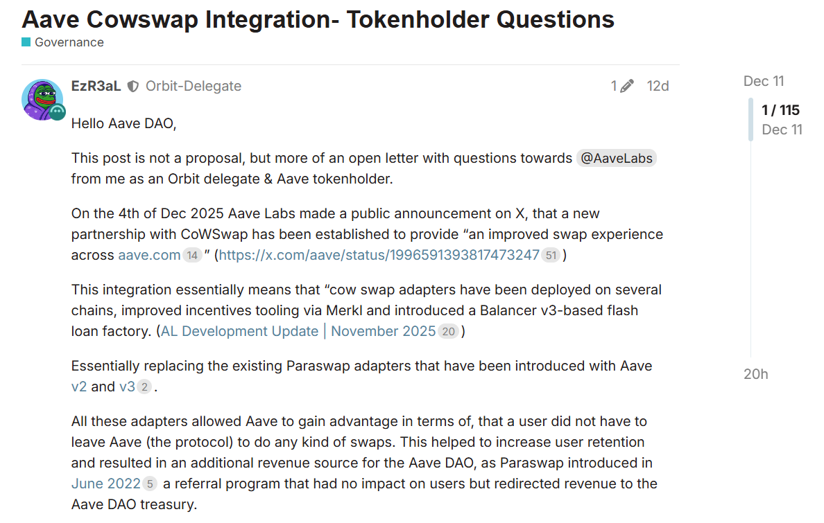 Aave Labs, команда, которая строит и поддерживает продукт, перешла на новый сервис CoWSwap для обмена крипты внутри платформы. Формально это выглядело как улучшение условий для пользователей и дополнительная защита.