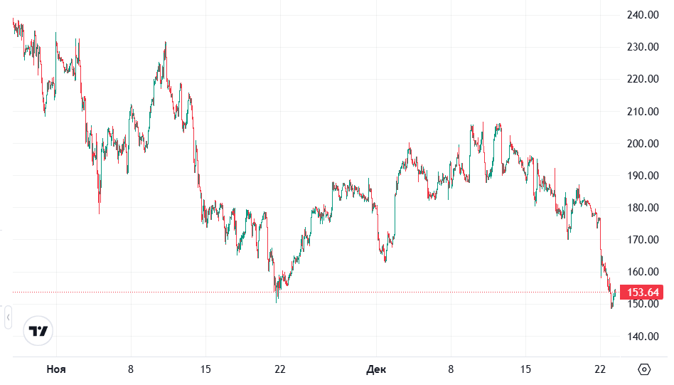 График криптовалюты Aave. По состоянию на момент написания обзора, монета торгуется на 76% дешевле максимума, зафиксированного на уровне $666 в мае 2021 года График: TradingView