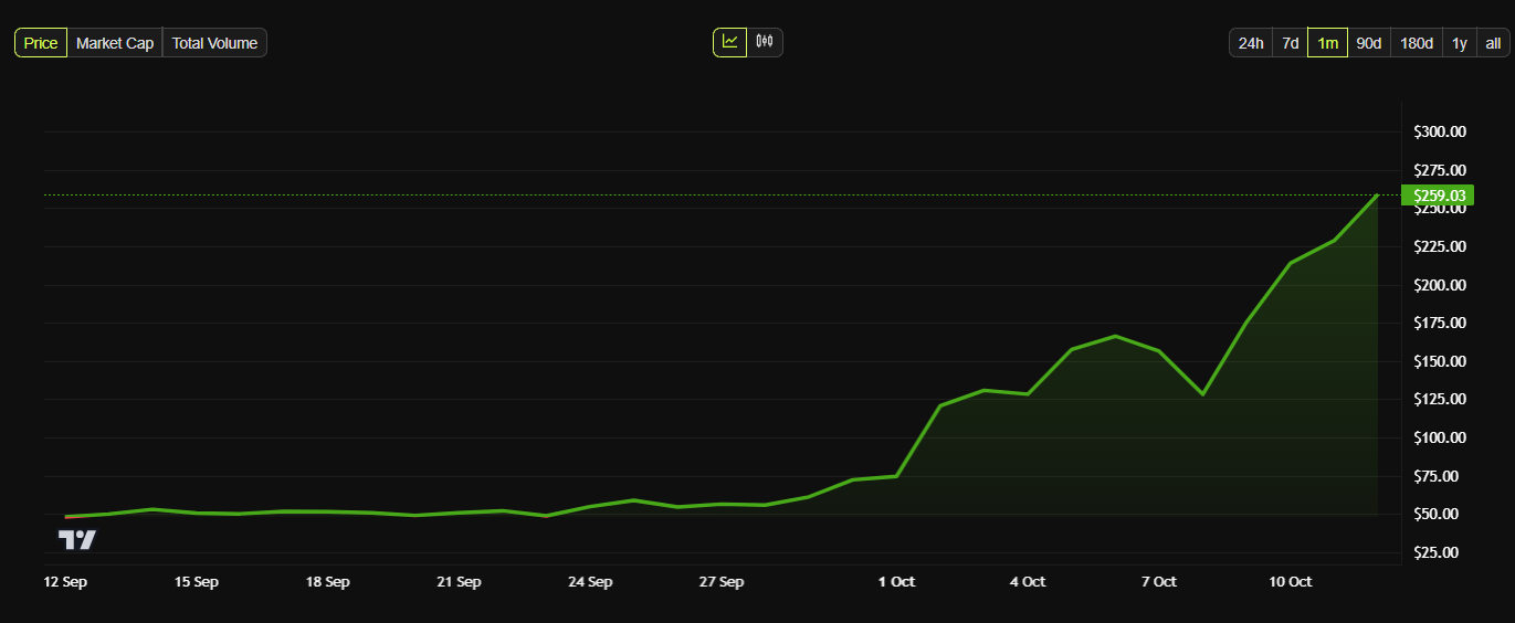 По данным BeInCrypto, цена ZEC кратковременно достигла $282,59 11 октября, прежде чем снизиться до примерно $257,96. Даже после этого отката токен показал дневной прирост на 15% — самый сильный с конца 2021 года, когда он торговался около $295.
