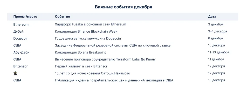 • 3 декабря — хардфорк Fusaka в основной сети Ethereum.